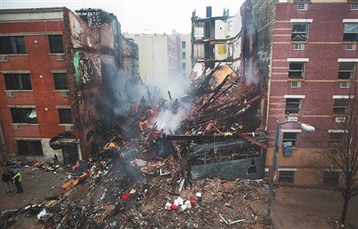 美國紐約哈林區發生威力強大的瓦斯爆炸事故,兩棟公寓瞬間被夷為平地,造成至少六人死亡,六十多人受傷。 圖/路透
