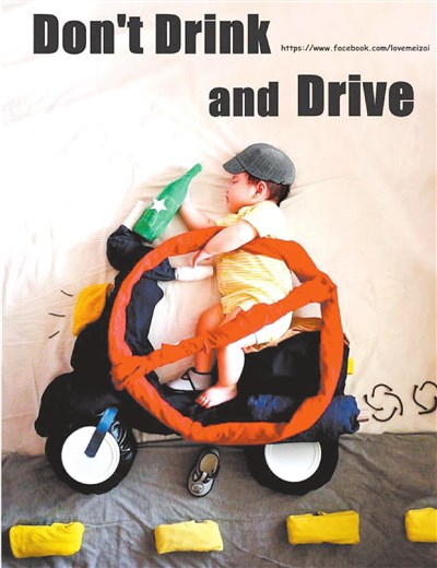 江香儀笑說,她幫熟睡的兒子手、腳「喬」成開車、騎車的模樣後,透過其他「道具」設計了反酒駕的畫面,結果,她上傳到臉書後,不少員警爭相拿這照片當宣傳海報,還有人說「這照片中的主角太萌了,看到他,心都融化了,誰還想酒駕」。