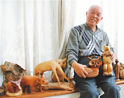 【本報新竹訊】八十歲的寶山鄉民劉冠軍,公職退休後,與妻子利用傍晚時分走路散步,看到颱風過後斷落的木頭,覺得可惜,報備鄉公所後把它們撿回家雕刻,成為一件件藝術擺飾。