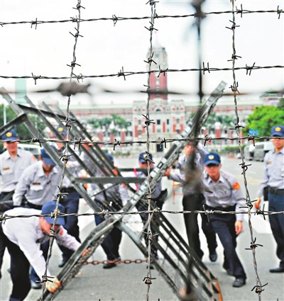 反服貿團體周日將上凱道,員警昨日在凱道上加強拒馬,嚴防總統府發生像行政院被占領情況。 圖/中央社