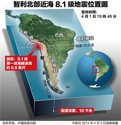 【本報綜合外電報導】智利北部伊基克(Iquique)外海99公里處,1日(台北時間2日上午7時46分)發生規模8.2強震,震源深度僅10公里,連鄰近的祕魯和玻利維亞首都拉巴斯(La Paz)都感覺得到,且隨後又發生規模6.2餘震。由於北部海岸發生土石流,並引起小海嘯,智利當局下令沿海地區民眾至地勢較高處避難,當地電話通訊和飲水並未中斷,不過部分地區電力中斷。鄰近的厄瓜多和秘魯當局也發布海嘯警報。