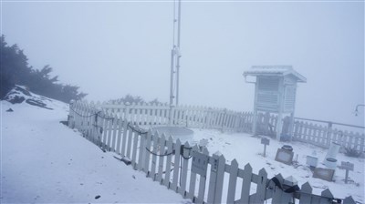 玉山主峰線至北峰氣象站今天上午再降四月雪的雪況,累計積雪2.3公分。圖/玉山氣象站提供