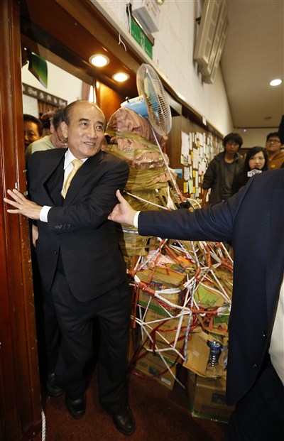 王金平從目前唯一可通行的窄門進入議場內探視學生,這也是王院長在立院被學生占領後首次進入議場。圖/鄭超文