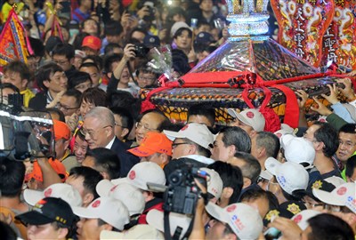 台中大甲鎮瀾宮媽祖昨天深夜展開九天八夜遶境起駕活動,深夜十一時由副總統吳敦義及台中市長胡志強等人扶轎下,神轎緩緩走出鎮瀾宮。圖/于志旭