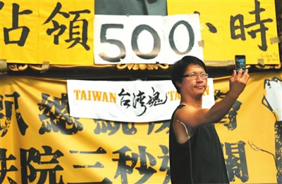 立法院議場內,昨天有不少人到處拍照留念,預告占領行動即將落幕。昨天凌晨四時,議場上的占領進入第五百小時,學生拿起手機自拍,記錄學運史上的里程碑。 圖/許正宏