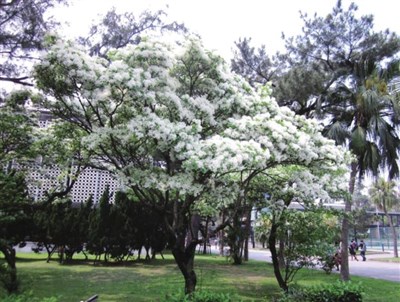 在流蘇花背後的白色大樓是台灣大學有名的洞洞館——農業陳列館。它最大的特色就是牆面鑲嵌琉璃筒瓦,以現代材質表現中國建築的傳統元素,由國際知名建築師貝聿銘的弟子張肇康建築師所設計,於一九六三年落成。