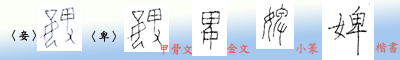 「婢」字早在商代的甲骨文中就有了,不過字形是「從妾、從卑,會意」,直到金文以後才改為「從女、從卑,會意」,其意並無改變。