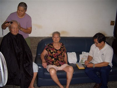 邱雲瑩(右)和妻子探視社區長者,夫妻倆幫老人家理髮。圖/台北市萬華區健康服務中心提供