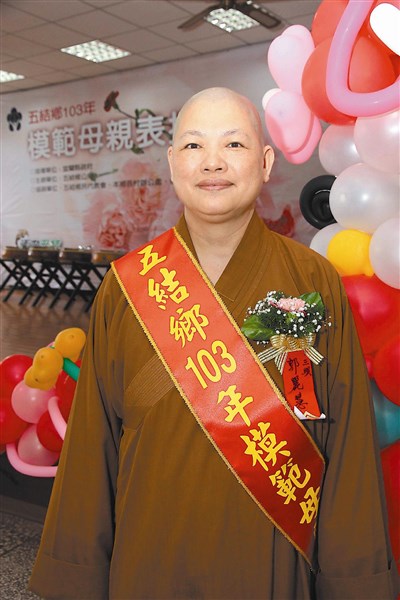 宜蘭縣普賢基金會創辦人真融法師,因收容孤兒,獲五結鄉模範母親表揚。