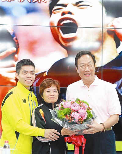 桌球國手莊智淵(左)昨上午與媽媽李貴美(中)拜會鴻海董事長郭台銘(右),郭董並贈花給李貴美表達敬意。圖/潘俊宏