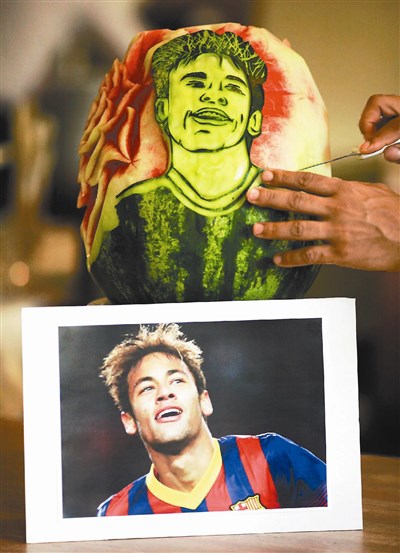 巴西七日公布世足二十三人名單,卡卡和小羅等名將落選;入選前鋒內馬爾將是進攻核心。同日在聖保羅一間飯店,廚師霍蘭達用西瓜雕刻內馬爾肖像。圖/路透