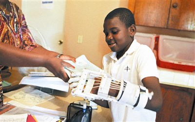 【本報綜合外電報導】十二歲海地孤兒約瑟夫(Stevenson Joseph)天生雙手沒有手指,在旅居美國加州的英國工程師馬歇爾幫助下,上月成為首個3D列印義肢的受贈者。