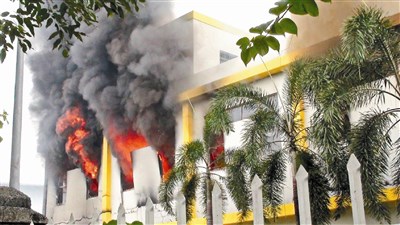 後來抗議群眾脫序衝進台商工廠,攻擊辦公室、洗劫財物並放火燒屋。圖/法新社