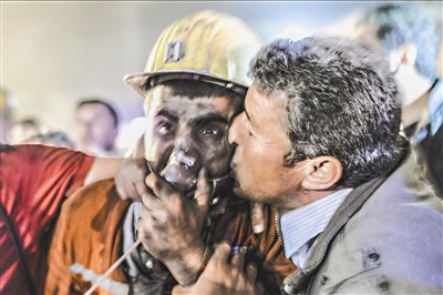 土耳其索瑪鎮煤礦發生礦災後,一名礦工獲救後,他的父親激動的親吻他。目前仍有數百名礦工受困地底,可能是史上死傷最慘重的礦災之一。圖/法新社
