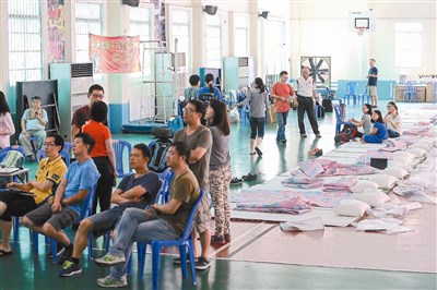 ?越南胡志明台灣學校成立緊急安置中心,約十幾位台商在此暫居,席地而睡,也隨時觀看電視掌握最新狀況。圖/程宜華