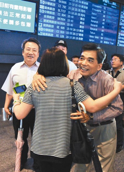 驚恐不安的越南台商昨天搭機返台,與親人擁抱,露出久違的笑容。圖/法新社