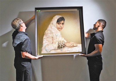 英國藝術家強納森‧楊所繪的巴基斯坦少女鬥士馬拉拉肖像畫,在紐約佳士得拍賣會以十萬美元拍出,拍賣所得將協助奈及利亞女性教育。圖/法新社