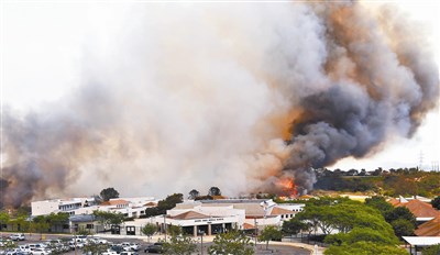 不過至少還有十多棟住宅和一棟公寓大樓受損,地方電視台畫面顯示,多棟建築物深陷火海,濃濃黑煙衝天,飄到太平洋上空。