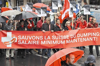 瑞士數萬名勞工五月在日內瓦及蘇黎世上街遊行,抗議瑞士未設立最低工資。勞工不滿的是,德、法兩鄰國都已設立最低工資,但人均收入傲視全球的瑞士卻未跟進。
