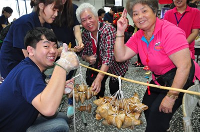 新北市醒吾科大學生(左方)擔任「世代義工」,他們到林口區東林社區關懷長輩,長輩教他們如何綁粽子,雙方PK後學生大輸,阿嬤看不下去幫忙補了幾粒,免得學生輸得太難看。圖/吳文良