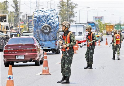 泰國軍方二十日宣布戒嚴,軍人二十一日在阿瑜陀耶省的公路哨站守衛。泰國陸軍總司令巴育昨天召集敵對政治團體、選委會委員和參議員共商如何解決危機。圖/路透