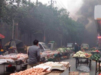 1位在早市賣清真蛋糕的商販,爆炸發生時火焰有1層樓那麼高,另1名賣馬鈴薯的商販說,聽到十幾聲爆炸聲。由於爆炸非常強烈,離爆炸地點2公里外都感覺到震動。微博目擊者稱,他看到2輛越野車衝入人群,車內有人將爆炸物扔出,其中有一輛車爆炸。至於燒毀的兩輛轎車,已被拖車拖離現場。