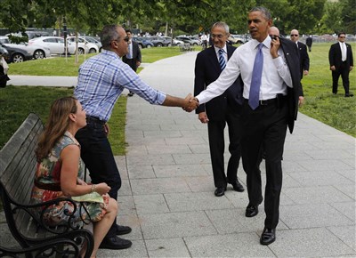 美國總統歐巴馬21日因公前往內政部,心血來潮選擇徒步往返內政部和白宮,沿途和以色列、中國大陸等國遊客打招呼,讓外籍觀光客大呼值回票價。這段路單趟要走10分鐘,歐巴馬雖未搭車,仍有特勤人員保護。圖/路透