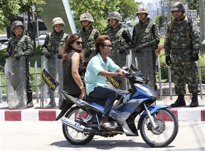 泰國軍方22日發動政變,解散看守政府,接管政權,但百姓似乎沒受太大影響。今天在曼谷的皇家陸軍俱樂部外,民眾輕鬆的騎機車經過站崗的官兵。圖/美聯社