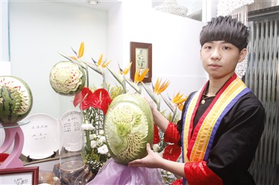 彰化縣田中鎮達德商工學生陳冠閔 參加農委會台灣瓜果節瓜果雕刻競賽,榮獲冠軍,雕功了得。圖/林宛諭