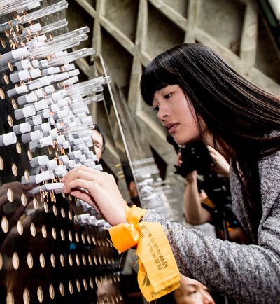 東海大學學生昨天發起「愛東海」行動,同學們將為受難者及其家屬禱告祈福的卡片,放置在東海大學路思義教堂的祈禱牆上。圖/黃士航