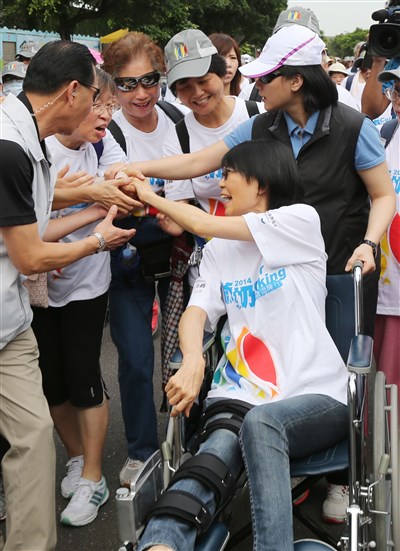 總統夫人周美青(右)上午出席「2014爺奶Color Walking-千人萬歲逗陣行」健走活動,因腳受傷改坐輪椅的周美青,由隨扈推著走完全程,民眾熱情爭搶著握手。圖/蘇健忠