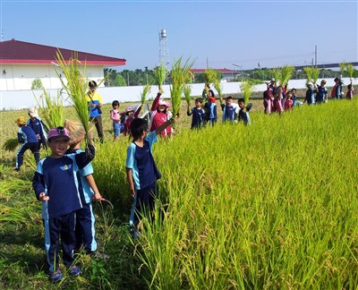 最特別的是,這6分田不止開放認股,農民還開放一部分農田,讓大明國小鳳明分班的小朋友響應農糧署的食農教育活動,從插秧開始,老師就帶著小朋友實際「巡田」,先是學插秧、除草,今天再實際體驗割稻。