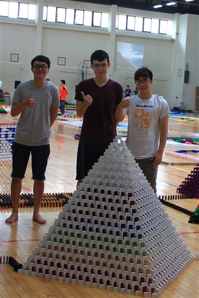 困難度最高的金字塔由管科畢業生呂學旻、楊子謙、高靖閔等人負責,曾六次「失手」金字塔骨牌全倒,他們不氣餒,重頭來過,終於在活動前10分鐘完成,全場響起一片歡呼聲。楊子謙開心說,金字塔共有7、8千片,設計為20x20的實心金字塔,歷經17個小時才完成,非常辛苦。