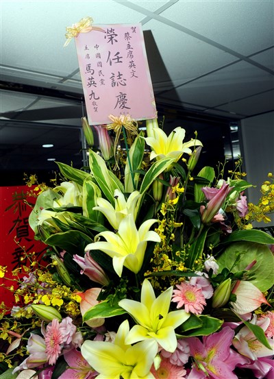 民主進步黨發言人張惇涵晚間公布第15屆民進黨主席選舉結果,由前民進黨主席蔡英文勝出,囊括了93.71%的選票。圖為總統馬英九致贈慶賀當選的花籃。圖/中央社