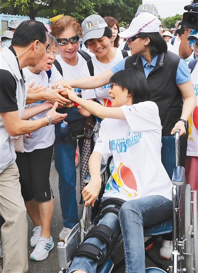 總統夫人周美青(右)昨天出席「爺奶Color Walking—千人萬歲逗陣行」健走,因腳受傷改坐輪椅的周美青,由隨扈推著與爺爺奶奶們一起走完全程,途中民眾熱情地爭著與她握手,還有人大叫「周美青我愛你」。圖/蘇健忠