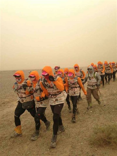 為了對抗鋪天蓋地的黑沙暴,台大EMBA戈壁挑戰隊改採3人行,排成一行列一起走,但度過黑沙暴考驗後,還得在豔陽下,背著沉重水袋與GPS等裝備,走過戈壁灘、鹽鹼地、丘陵等嚴峻地形,每天徒步20、30公里,身上的塵土用溼紙巾怎麼擦也擦不乾淨,緊湊艱辛的賽程,是前所未有的大考驗。