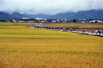 台東縣池上鄉天堂路、伯朗大道、金城武大樹,遊客川流不息,池上鄉公所研議車輛管制措施,產業道路破天荒交管。圖/中央社