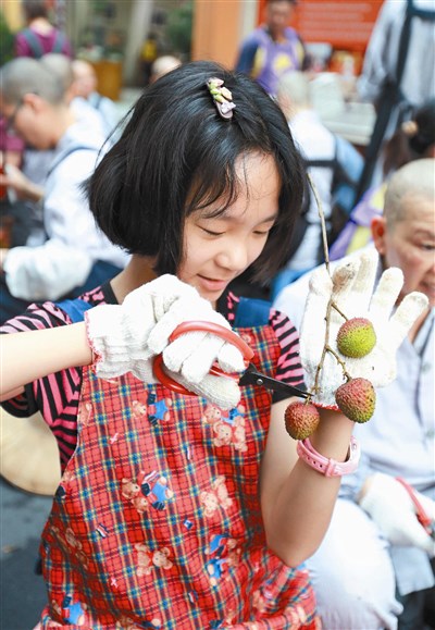 「阿嬤,佛光山明天要包裝荔枝,我要請假上山幫忙。」國小四年級的羅郁安得知佛光山要出坡,歡喜拉著阿嬤陳惠珠來山上當義工,拿著剪刀剪去枝枒,手腳俐落,動作一點也不馬虎。她童言童語的說:「第一次參與荔枝出貨,最好玩的就是剪荔枝。」