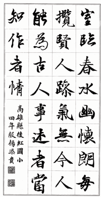 《小小書法家》 |2007.01.04 語音朗讀 458觀看次 字級 大 中 小 ▲高雄縣後紅國小四年級 楊添貴▲台北市建安國小五年十六班 林瑞旗▲台中縣龍泉國小四年級 高芯苹 前一篇文章 《創作花園》營養午餐 下一篇文章 《走訪山海史蹟》飲水思源 曹公功在台灣 熱門新聞 01渥太華佛光山 授海狸童軍領巾2025.11.1702【閃文集】貓咪成長的魅力2025.11.1803【快樂塗鴉簿】熱鬧的內灣小鎮2025.11.1704【詩】遊園地.競馬場2025.11.1705克林姆富家女肖像畫 估值46億元2025.11.1706AMR機器人 是什麼?2025.11.1707【島嶼拼圖】啜飲時光佳釀:探訪嘉義文化創意產業園區 2025.11.1808中日緊張 陸4海警船巡航釣魚台2025.11.1709落葉刺繡 巴西百鳥寫真集2025.11.1710【考考你的智力】2025.11.17 訂閱電子報 台北市 天氣預報 台灣一週天氣預報 相關報導 寶寶成長禮 抓周做公益聆聽受傷的童年 北市家防中心推兒少保護展支持18歲公民權 家扶:更符公平正義影音/可愛童音 我還在咳嗽 幫我請假啦影音/天生善良 小女孩哭:我不要吃動物吃什麼都癢?如何減少嬰兒食物過敏