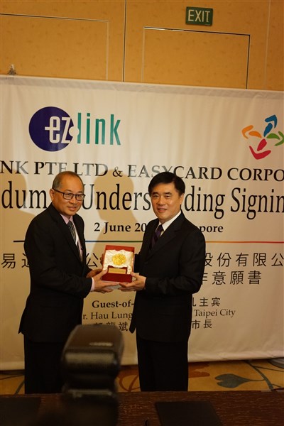 台北悠遊卡董事長張家生與EZ-Link總經理Nicholas Lee上午在新加坡簽署MOU,悠遊卡首度跨出台灣,台北市長郝龍斌說這是跨國服務的第一步,方便往返台灣與新加坡的觀光客或商務旅客使用。