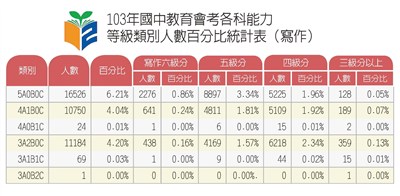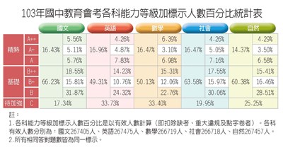 103年國中教育會考各科能力等級加標示人數百分比統計表