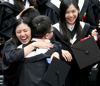 台灣大學今天舉辦102學年度畢業典禮,同學們互相擁抱。圖/余承翰