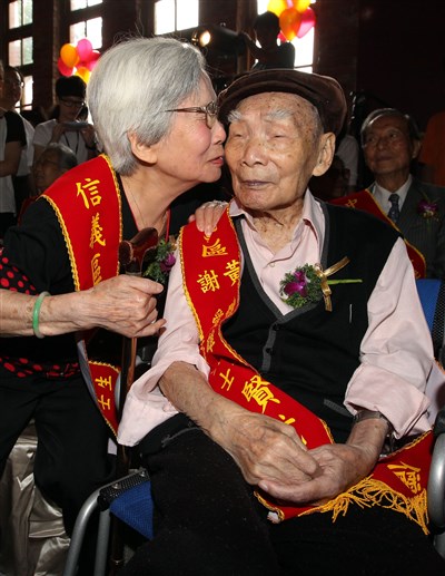台北市舉行103年度金婚表揚活動,黃體雄(右)、謝愛華(左)夫婦甜蜜結褵75載,他們透露相處之道是相敬相愛,台北市長郝龍斌稱讚他們是「執子之手,與子偕老」典範。圖/中央社