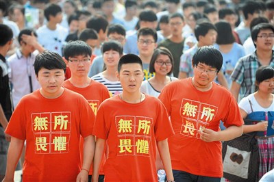 下圖為一名穿著印有「無所畏懼」四字紅色T恤的學生,七日步入安徽省亳州市考場。圖/法新社