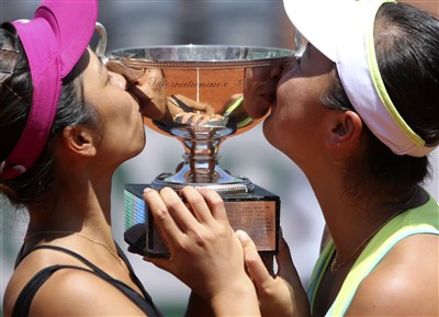 謝淑薇/彭帥於法網女子雙打奪冠,親吻獎杯。圖/美聯社