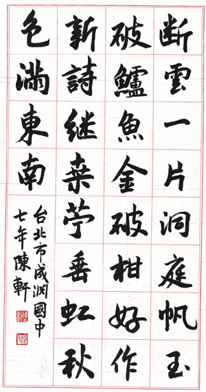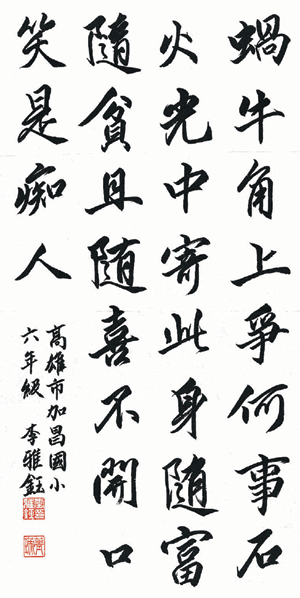 《小小書法家》 |2007.01.06 語音朗讀 428觀看次 字級 大 中 小 ▲台北市成淵國中七年級 陳軒▲高雄市加昌國小六年級 李雅鈺 前一篇文章 《創作花園》快樂的滋味 下一篇文章 《成長加油站》抉擇 熱門新聞 01快遞4千件新衣 台北佛光人送愛到花蓮2025.10.0402逾850校學生 每天閱讀《人間福報》2025.10.0403星雲大師全集⑲【佛教管理學②】叢林的管理法③2025.10.0404印度生命線快車 治療百萬人2025.10.0405日自民黨選黨魁 麻生握關鍵票數2025.10.0406馬太鞍溪再遇豪雨 恐又成堰塞湖2025.10.0407以軍攔截援助加薩船隊 全球抗議2025.10.0408【印象旅人】盧比安納可愛的水龍頭2025.10.0409【海闊天空】繞一圈瀨戶內 品賞關西文史2025.10.0410美駐陸大使:一中政策不變2025.10.04 訂閱電子報 台北市 天氣預報 台灣一週天氣預報 相關報導 【快樂塗鴉簿】彩墨山水【TAIWAN寶島 覽勝】台南孔廟【快樂塗鴉簿】旖旎月色【世界好奇妙】高跟鞋的奇幻冒險【小藝術家】我們這一班【成語‧.故事】賣劍買牛
