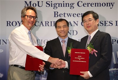在交通部長葉匡時(中)的見證下,台灣港務總經理李泰興(右)與皇家加勒比集團副總裁John Tercek(左)共同簽訂合作意向書,斥資10億元澎湖建碼頭。圖/陳正興
