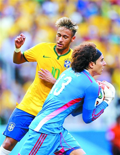 圖右的墨西哥門將歐喬亞化身超人,全場6度成功撲救,其中還包括飛身撲救內馬爾(Neymar)一記幾乎是必進的頭錘險球,力挫巴西氣勢,獲得2隊球員一致讚揚。圖/美聯社