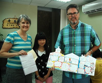 鄉長李泗濱與日友協理林隆煒送了書寫著英文的交趾陶,感念這對洋夫妻跨國獻愛,許多學生也送來感恩卡,其中遠從麥寮鄉的國三生林雅萱信中,字裡行間難捨離情,字字感人,她說,艾老師眼中的孩子都是天使,如今離別格外傷感。