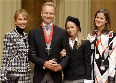 英國搖滾老將史汀(左二)名成業就,圖為他2003年獲女王伊麗莎白二世頒獎授勳,和妻子(左一)及兩個女兒合影。圖/路透